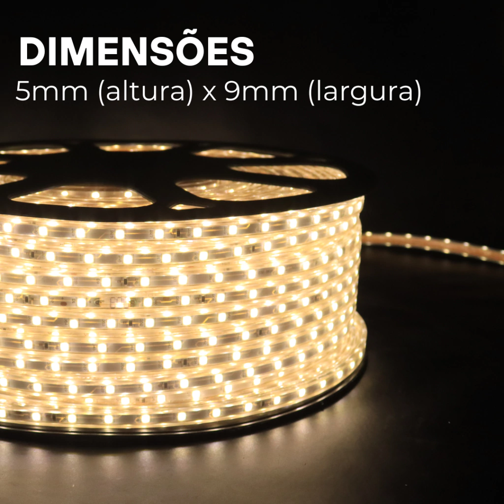 Com 100 metros de comprimento e perfil fino de 5x9mm, emite luz branco quente (3000K) suave e agradável, ideal para criar ambientes acolhedores e sofisticados.
