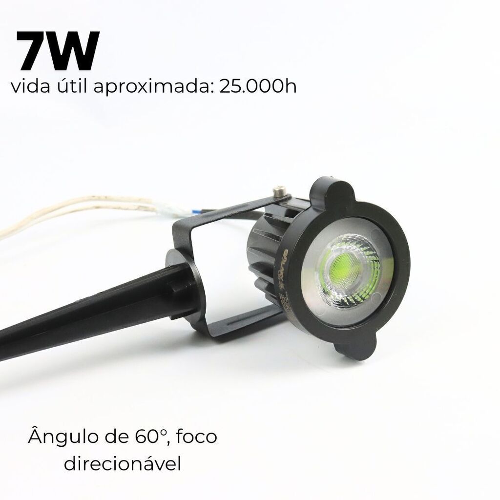 Com potência de 7W e proteção IP65, o espeto é resistente à chuva e poeira, garantindo excelente desempenho em ambientes externos. Além disso, é bivolt e possui corpo robusto, oferecendo durabilidade e baixo consumo de energia.