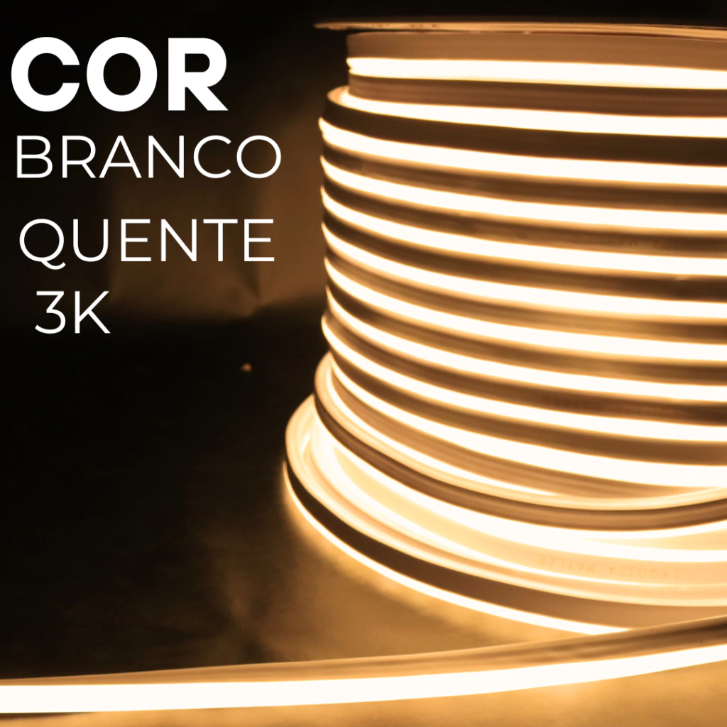 A Mangueira LED Neon 6mm x 1,3cm 100M 220V Branco Quente 3000K IP65 LED 2835 é a escolha ideal para quem busca iluminação contínua, decorativa e com visual sofisticado.